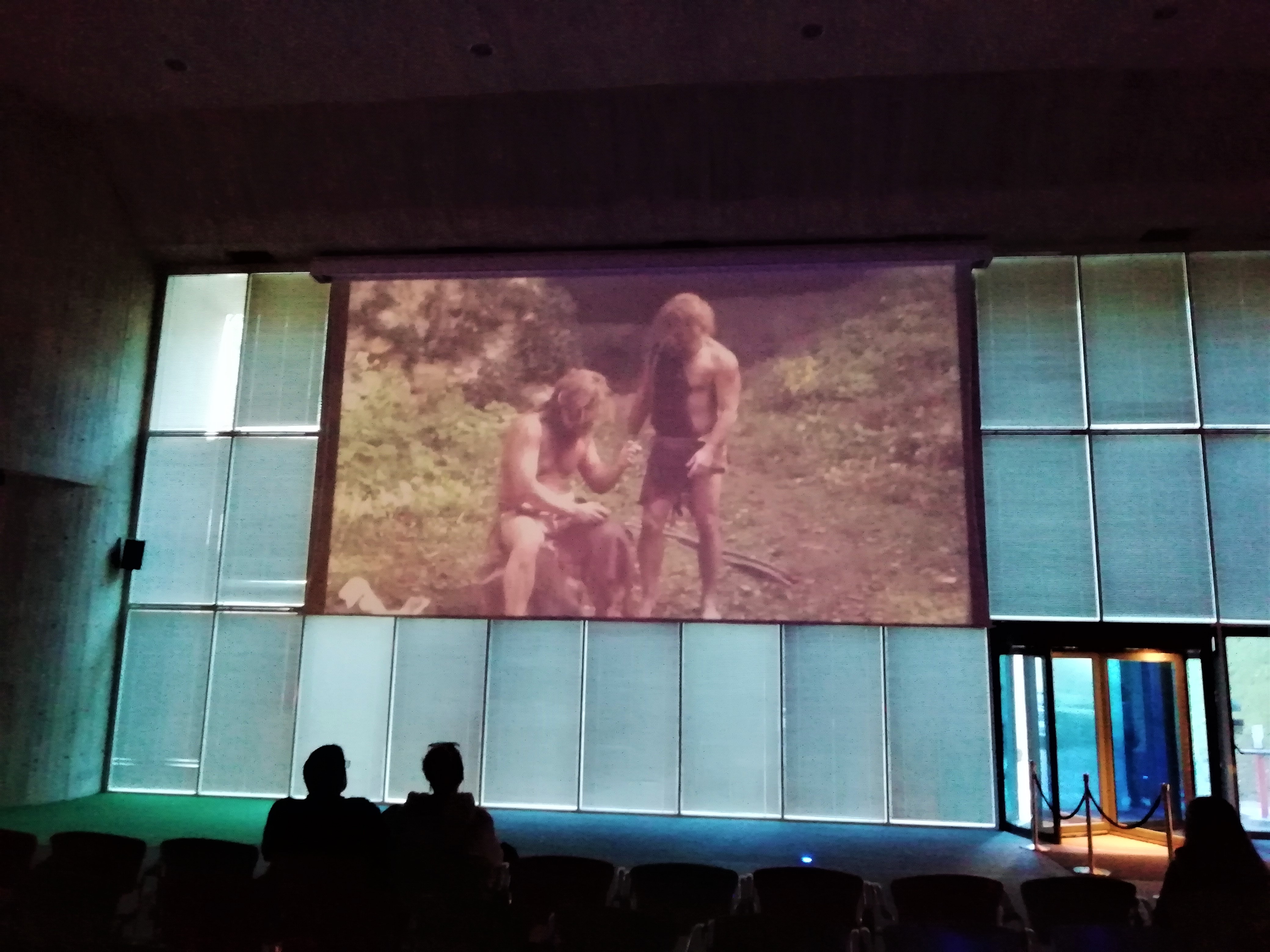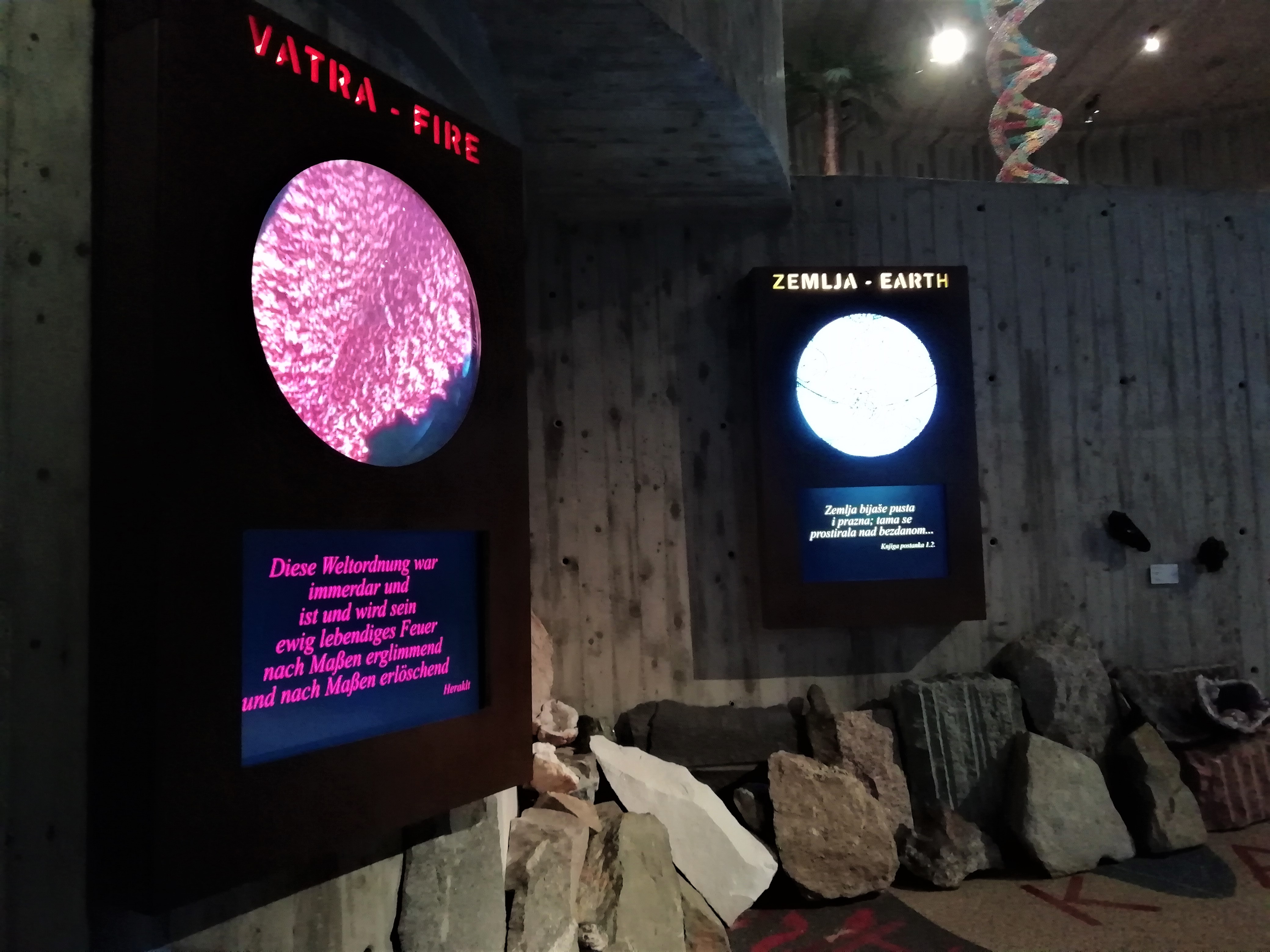 Unutrašnjost izvedena u betonu, «umjetnom kamenu», pojačava simulaciju prapovijesnog staništa, u kojem posjetitelj, kao i svojedobno neandertalac, može promatrati vanjski okoliš. Staklena stijena postaje ekran na kojemu se projicira film o svakodnevnici pračovjeka, a posjetioci gledajući iz pozadine postaju sve više sustanari krapinskih neandertalaca. Na samom početku, odmah, želi se uspostaviti što neposredniji kontakt posjetioca i teme. Moram spomenuti da je malac oduševljeno pratio filmić, iako smo mrvicu zakasnili na početak brzo se “ufurao” u temu …
