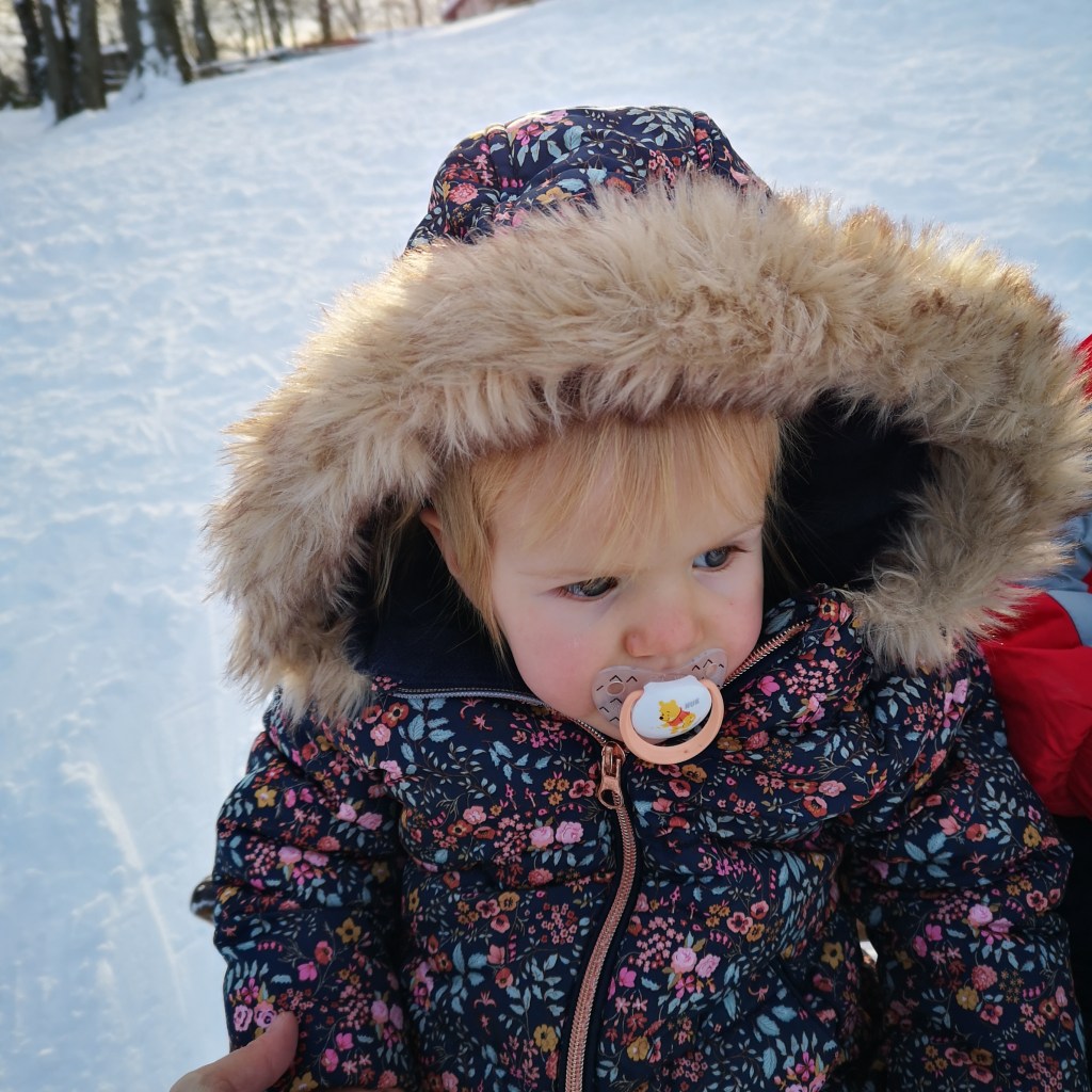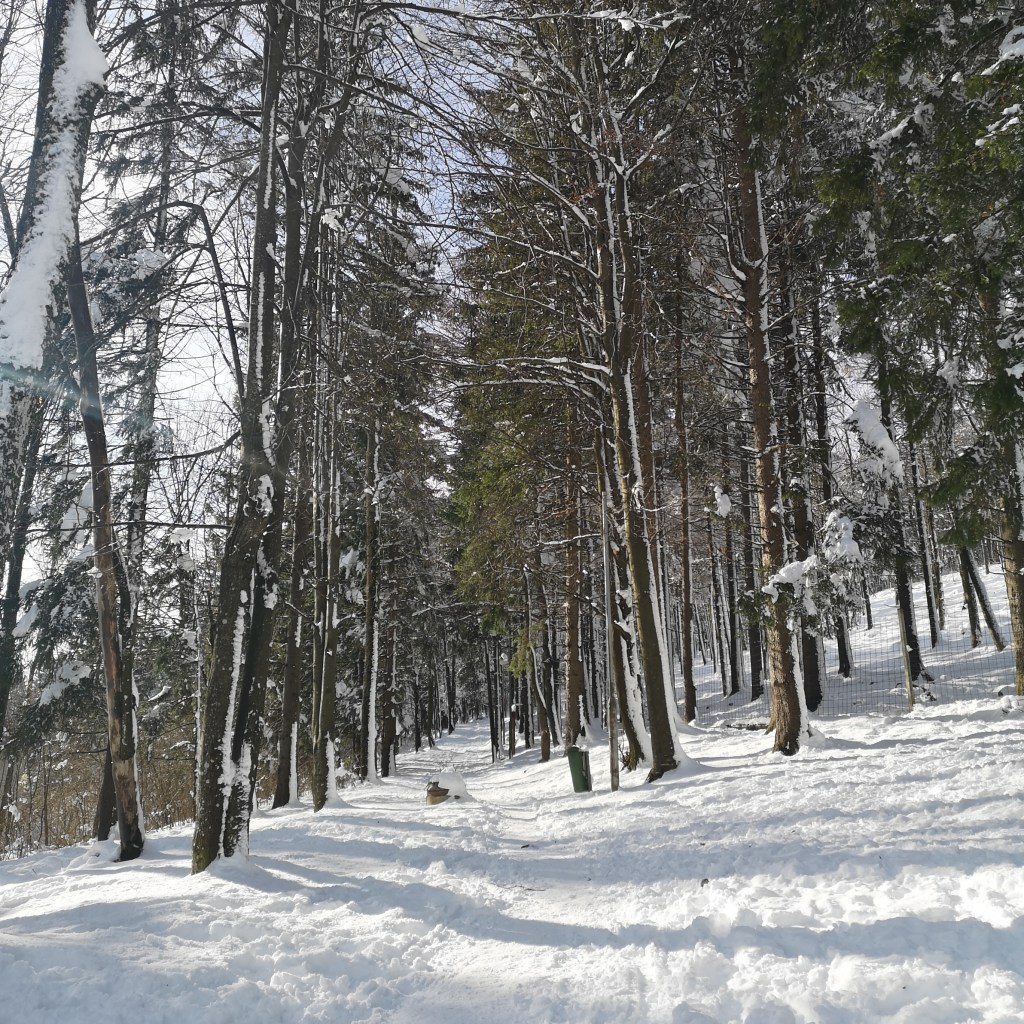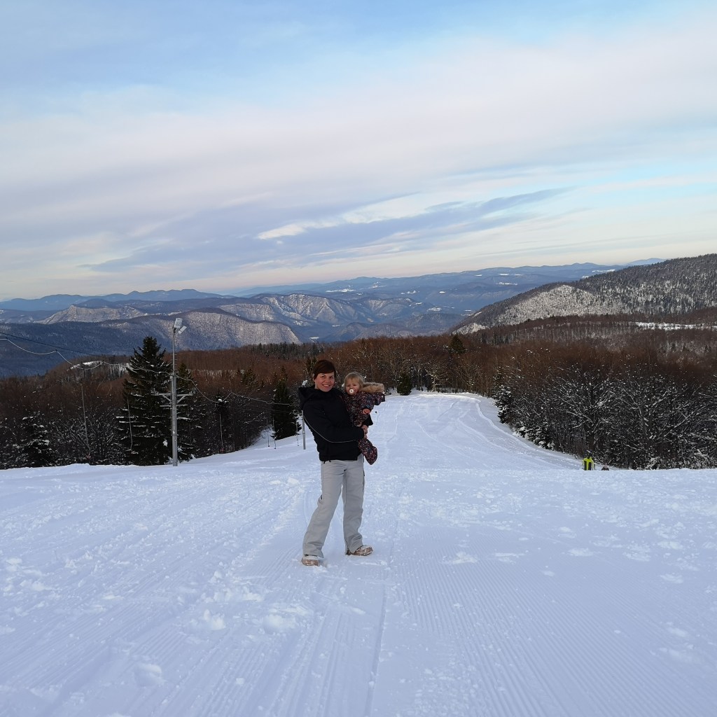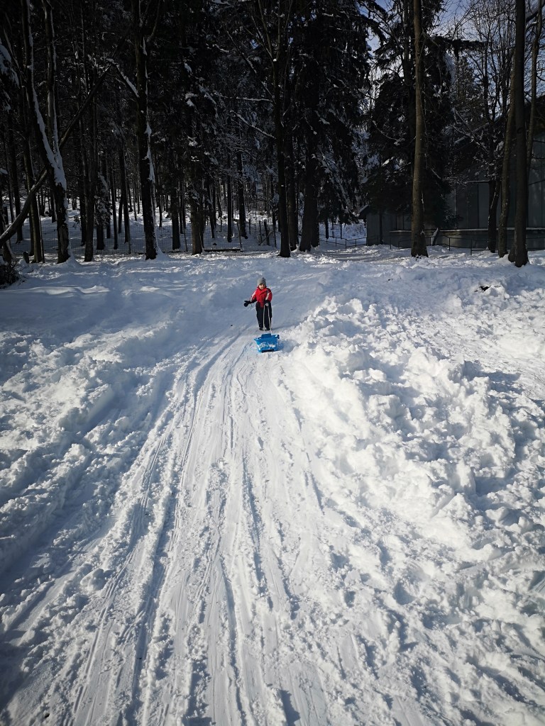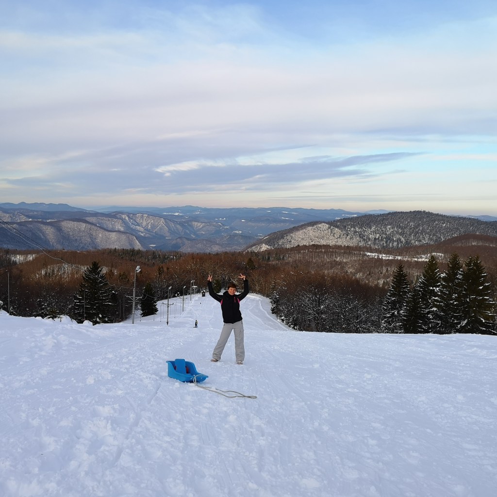 Skijaška vučnica nije radila jer je bio radni dan. No to nas nije spriječilo da se nekoliko puta spustimo dolje na sanjkama. Doduše dovući se gore je bilo malo teže negoli sam to mislila kad sam odozgo gledala dolje … 🙂
