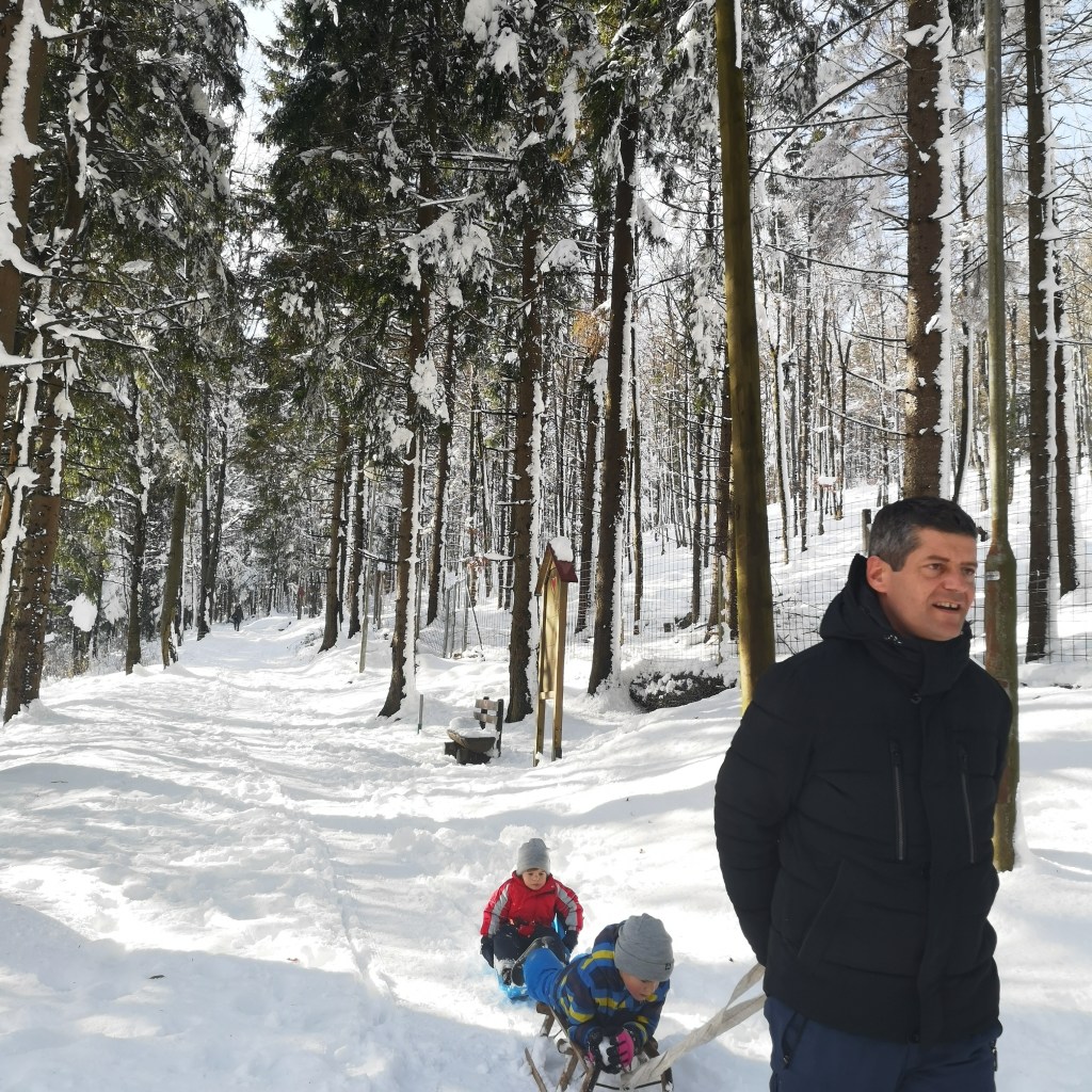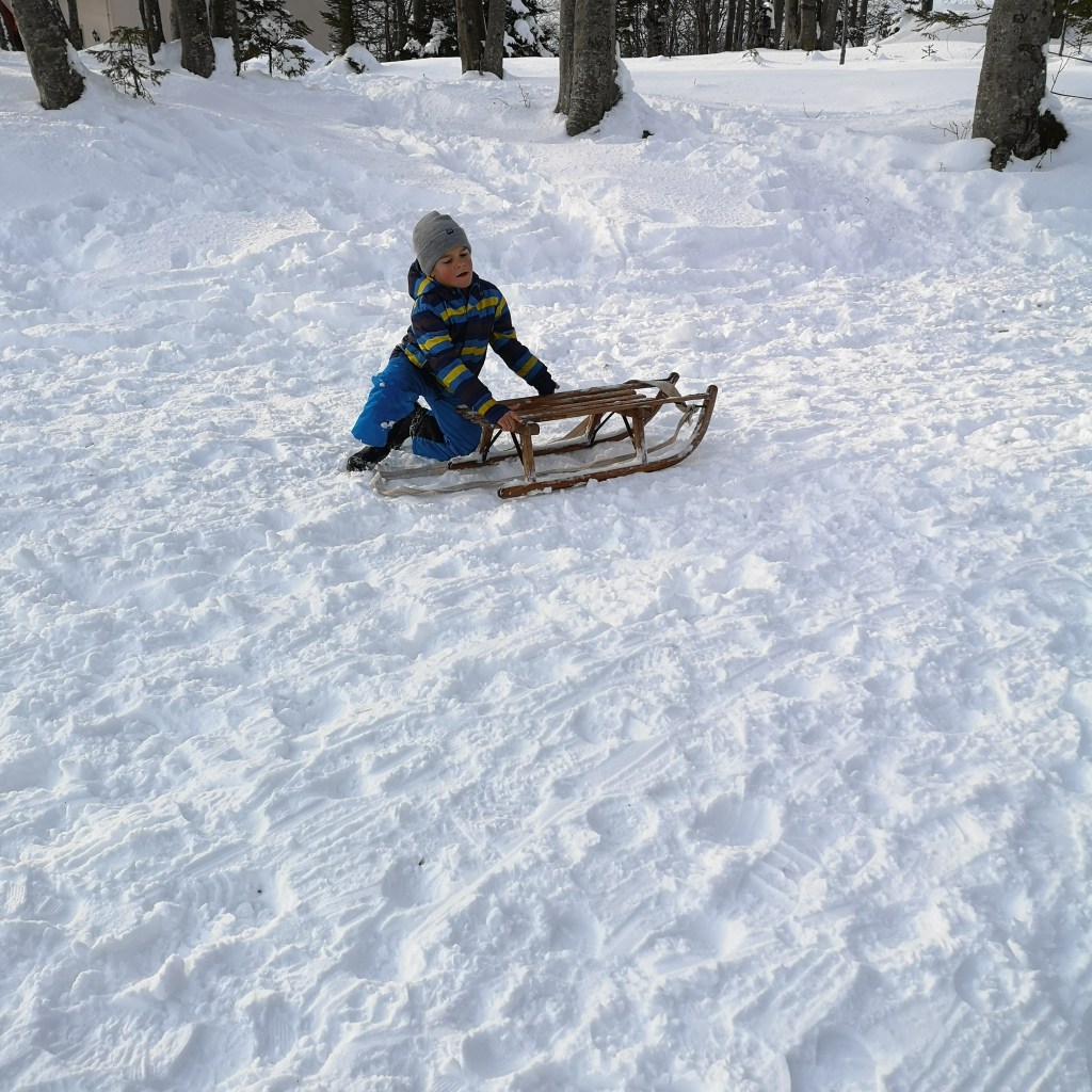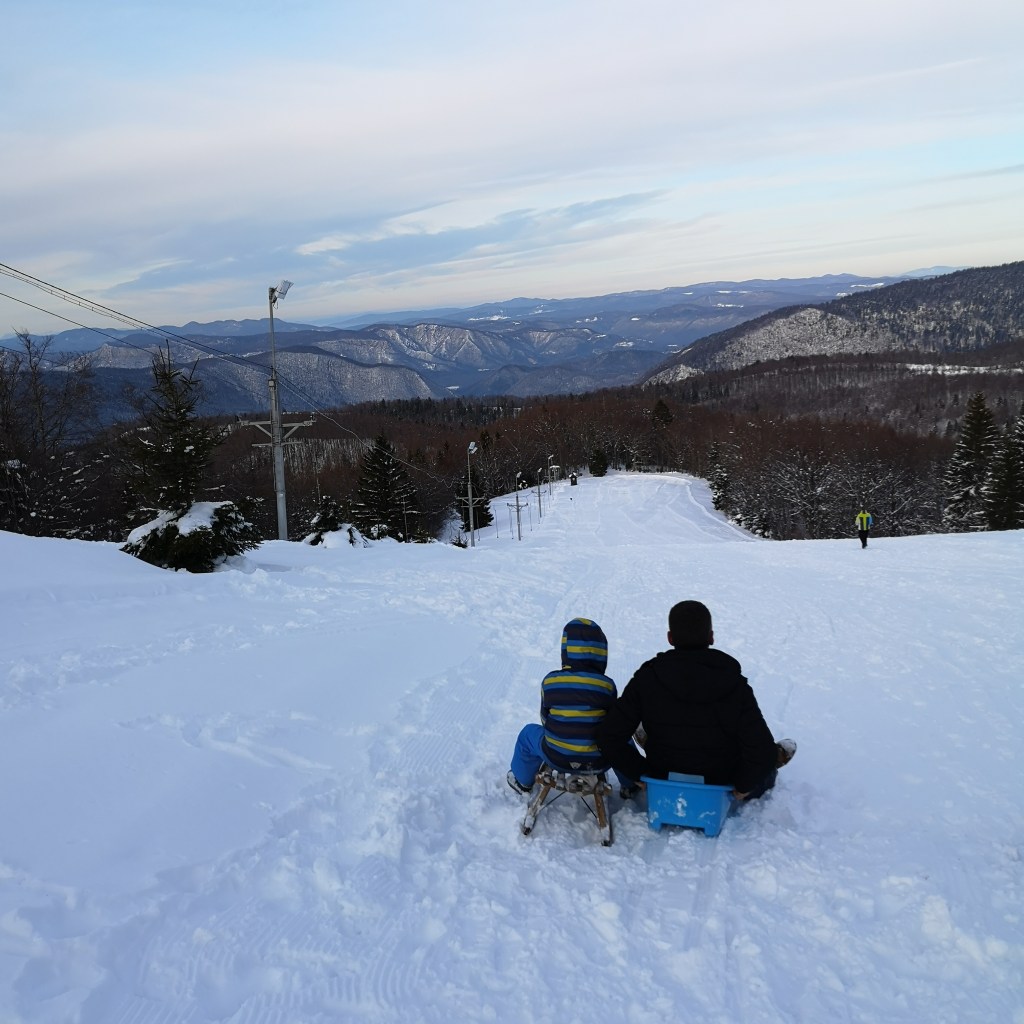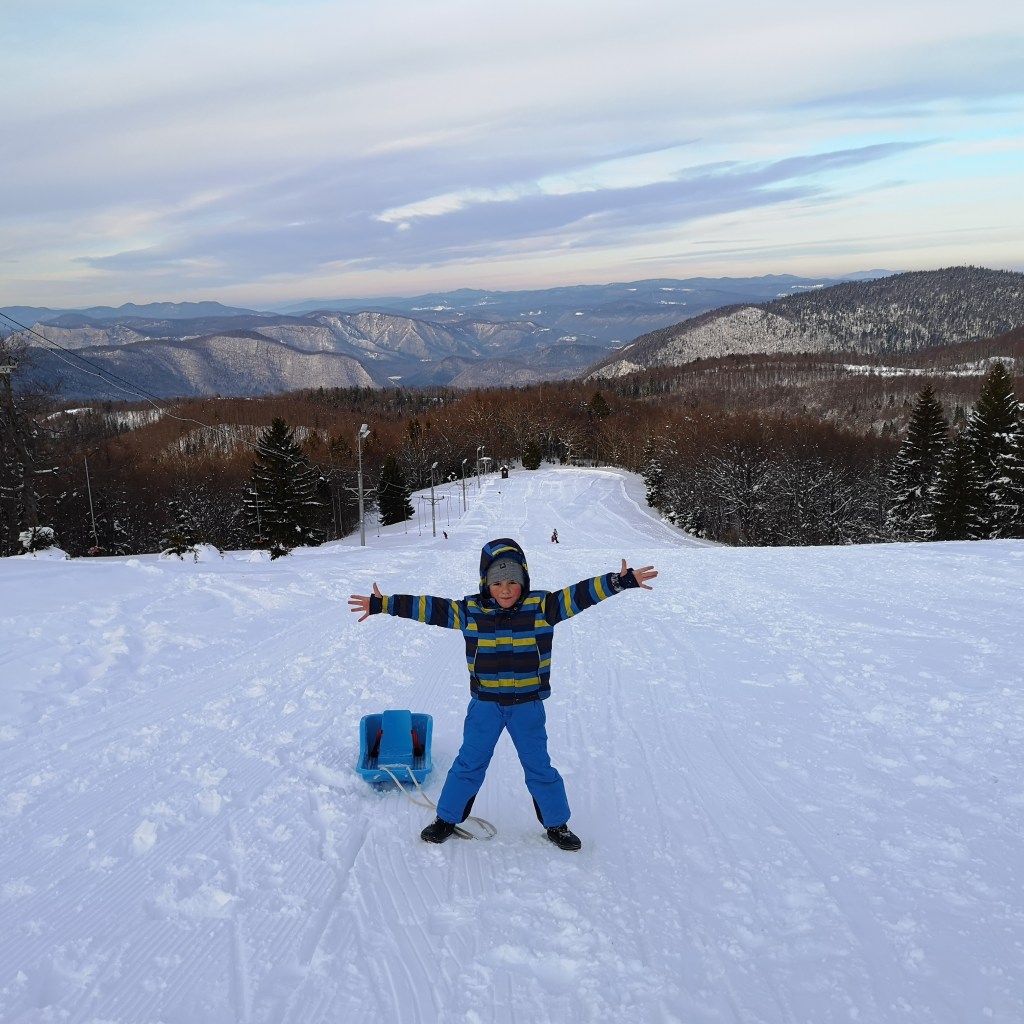 Ajmo sutra na sanjkanje … Sutra? Može … Ovako je počeo jedan razgovor prije nekih godinu dana (poprilično kasnim s objavom blog postova, znam, ali sada je otprilike to vrijeme i uskoro dolazi vrijeme sanjkanja i uživanja u snijegu…), kada sam ja standardno predložila da idemo negdje, ne očekujući baš potvrdan odgovor. Jer ruku na srce barem 20 puta dnevno nešto predložim, a i radilo se o radnom danu. No eto uspjela sam dobiti potvrdan odgovor. Ok idemo u Delnice i na Petehovac. Simple as that. Krenuli oko podne iz Zagreba i za manje od sat vremena evo nas u centru Delnica. Odluka pada na park kralja Tomislava. Čim smo se parkirali klinci su “uletili” u snijeg i jedva smo ih uspjeli poloviti.