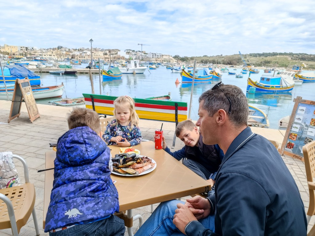 Meni je osobno Marsaxlokk jedno od dražih mjesta na Malti. Sav je nekako šaren, veseo, prepun ribara koji sjede na rivi uz svoje mreže ili popravljaju brodove. Nudi se odlična riba na menu-u u gotovo svakom ugostiteljskom objektu. Ovdje sam jela najveće i najfinije dagnje ikada (inače sam veliki fan dagnji). Riblja plata u kojoj dobijete dagnje, škampe i hobotnicu s pečenim krumpirićima za dvoje smo ovdje platili cca 20 eura. Plus dobili smo uz to dvije čaše vina gratis. Kažem vam ovdje se dobro jede za ok novce. Klincima su brodići i cijeli gradić jako simpatični pa smo se u Marsaxlokk vratili još i zadnji dan prije leta te ovdje pojeli ručak.