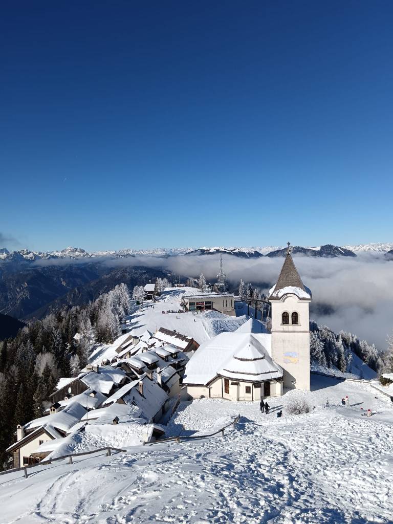 Monte Lussari je malo planinsko mjestašce na tromeđi Italije, Slovenije i Austrije, tako da se jasno očitava mješavina svih triju kultura. Na Monte Lussari dolazimo na jednodnevni izlet s slovenske Pokljuke gdje smo na skijanju za produženi vikend. Mjesto se nalazi na 1789 m nadmorske visine. Do njega se dolazi isključivo gondolom a vožnja traje 15-tak minuta. Cijena je 18 EUR za odrasle, 9 EUR za veću djecu, manja besplatno. Gondola radi od 09-16 sati. Ispred mjesta gdje se prodaju karte i gdje je polazna točka gondole ima dovoljno parkirnih mjesta koja se ne plaćaju. Ima nekoliko restorana, suvenirnica i svega 10-tak kuća. Ako ste vješti na skijama, dolje se možete spustiti i na skijama (full crna staza). Od Zagreba ima manje od tri sata do ovog bajkovitog mjestašca i odličan je izbor za zimski izlet. Nama je ovdje bilo toliko lijepo da nije isključeno da ćemo se i slijedeće zime navratiti barem na jedan dan. Foto-priča našeg boravka u Monte Lussariju u nastavku.